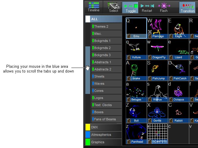 Categories help to organize the work space and only show the most relevant tabs. For example, if you are only looking for Graphic-related imagery, you can click on the Graphics category, and only those Pages and Cues related to graphics will be shown. To add, change or rename categories, just right-click in the Categories section.