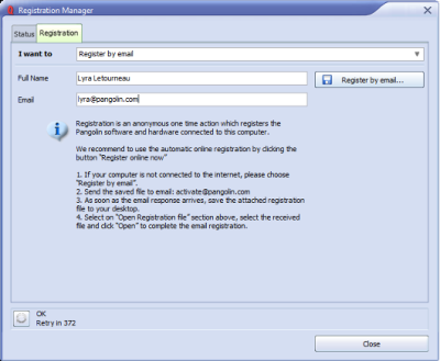 On the dropdown for Registration, use “Register by Email”, here you will fill out your Full name and Email and click “register by email”. Quickshow will then instruct you to save a “registration file” to your computer. This file will need to be then sent to Pangolin. Move this file to a pc on the internet, using a USB drive.