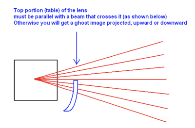 The third degree of adjustment is tilting the lens about the split at the top. If the top portion of the lens is at an angle with respect to the light coming from the X-Y scanners, there will be a kind of “ghost image”, which is a reflection off of the top surface of the lens. The lens angle should be adjusted so that the beams for the center of the projection are directly in angular alignment with respect to the top surface of the lens. Doing so will prevent the “ghost image” and the result will be perfect. The crude picture below shows the concept.