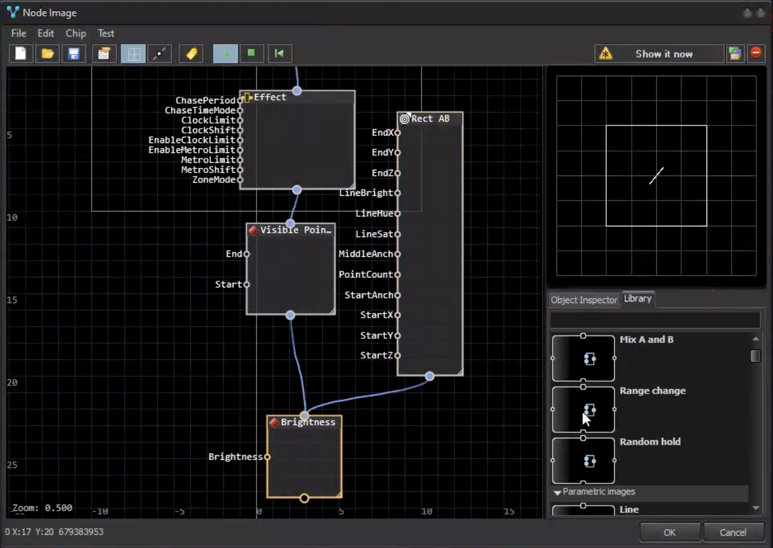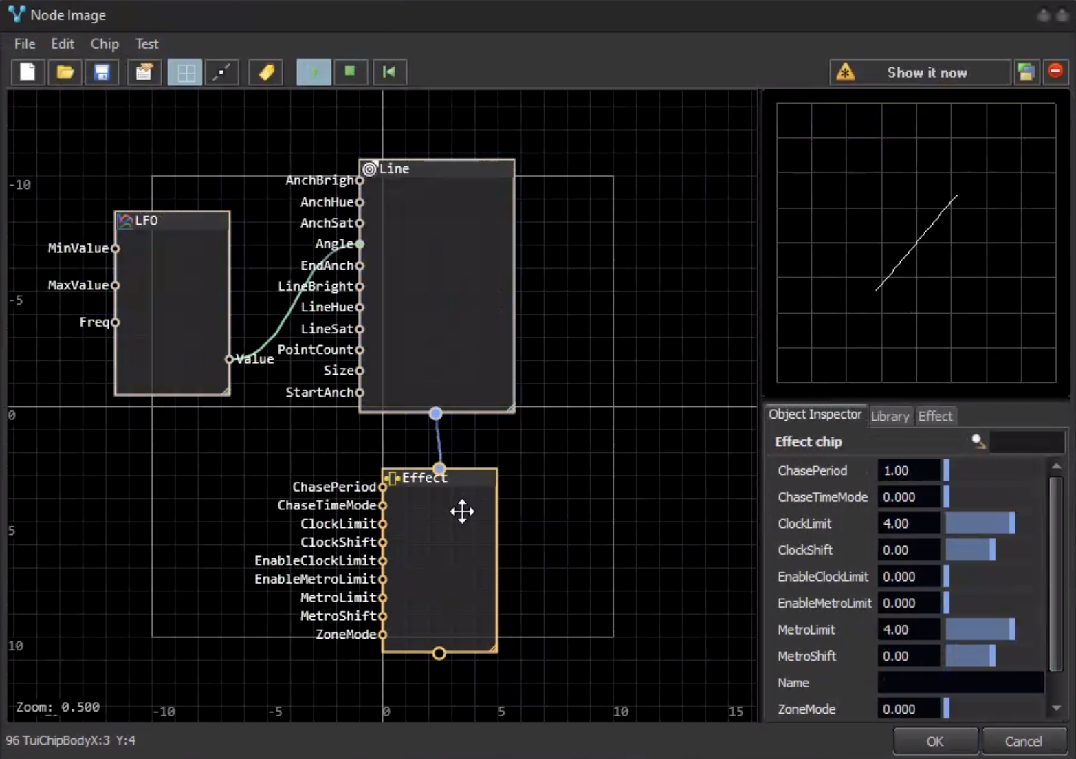 The effect node stores the effect inside. Such nodes have an input pin on top and an output pin on the bottom side of rectangle. You may connect the input pin of an effect to the output pin of an Image node, or to a complete other effect node.